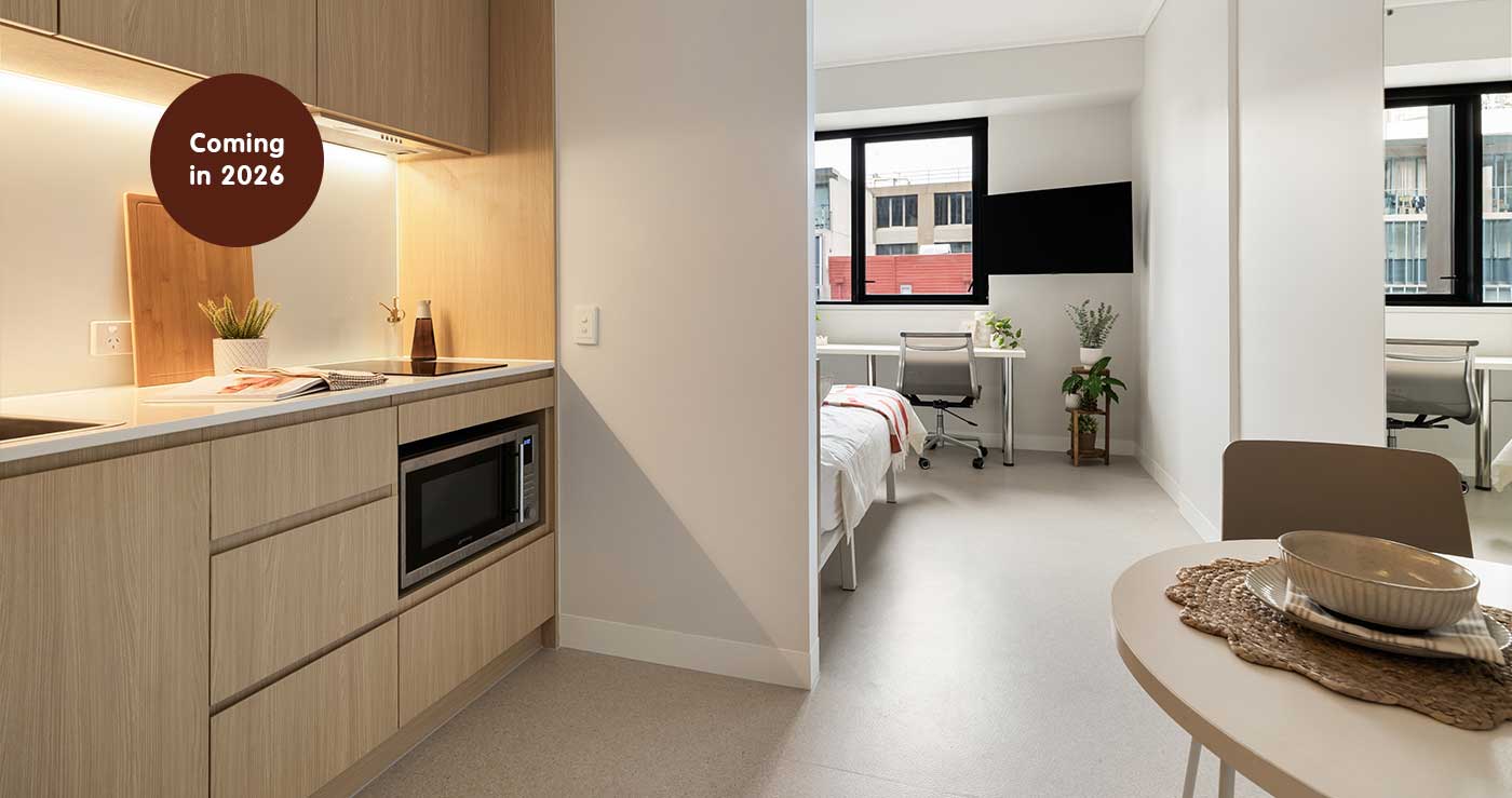 Our studio apartments have a combined sleeping and study space along with a private bathroom and kitchenette.